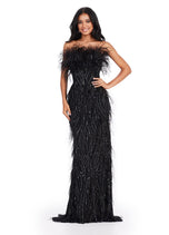 We're here for this look! This fully beaded strapless gown features an intricate beaded design and feathers throughout to help you stand out at your next event.