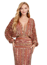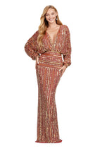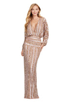 Fun and fabulous! This elegant, fully beaded gown features a v-neckline and dolman sleeves to give the perfect amount of glam at your next event.