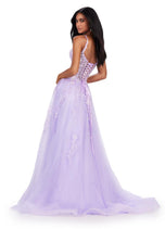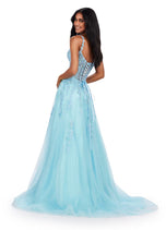 Living in a fairytale! This spaghetti strap gown features a v neckline with a lace applique bodice. The lace up back and glitter tulle skirt complete the look.
