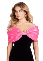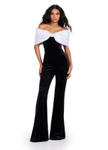 Be the center of attention in this unique and ravishing jumpsuit, a ASHLEYlauren masterpiece from Spring 2024. The all black slim fitting silhouette is created in soft velvet fabric and completed with an off-shoulder oversized satin bow detail. This is the perfect gown for any social event.