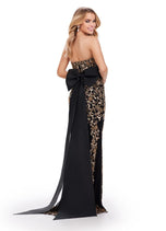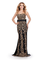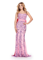 Leave a jaw dropping impression when you showcase this ravishing long fitted gown designed by ASHLEYlauren from Spring 2024. 11583, showcases a strapless sweetheart neckline with zipper back closure, a fitted silhouette that is beautifully garnished with intricate bead designs that run from top to bottom. The gown is completed with an eye-catching taffeta belt and oversized bow detail on the back with drape. This is the perfect attire for Prom, HoCo Parade to first pageant!
