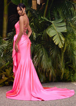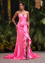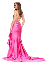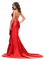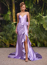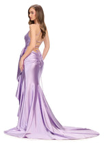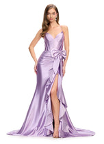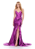 This ASHLEYlauren is so edgy and fabulous! 11638, has all the trendy details from Spring 2024 Collection. Created in rich shimmer jersey gown that highlight your figure. The corset top showcases a v cut neckline with dainty straps that form into an eye-catching lace-up on the open back. An oversized bow and cascading ruffle detail that falls onto the side slit. A dramatic train completes this phenomenal look!