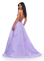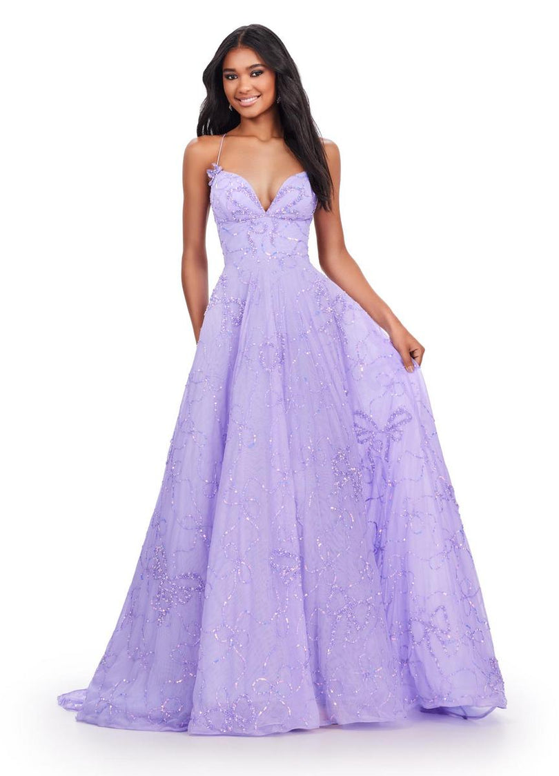 Shine from every angle as you walk into prom wearing this beautiful Aline gown designed by ASHLEYlauren from Spring 2024 Collection. 11658, displays a v neck with dainty straps that lead to an eye-catching lace up on the open back. The fitted top is decorated with beautiful floral lace detail. The full tulle skirt is adorned with glitter bow pattern that flows to the bottom of the gown and will sway effortlessly with every step you take.