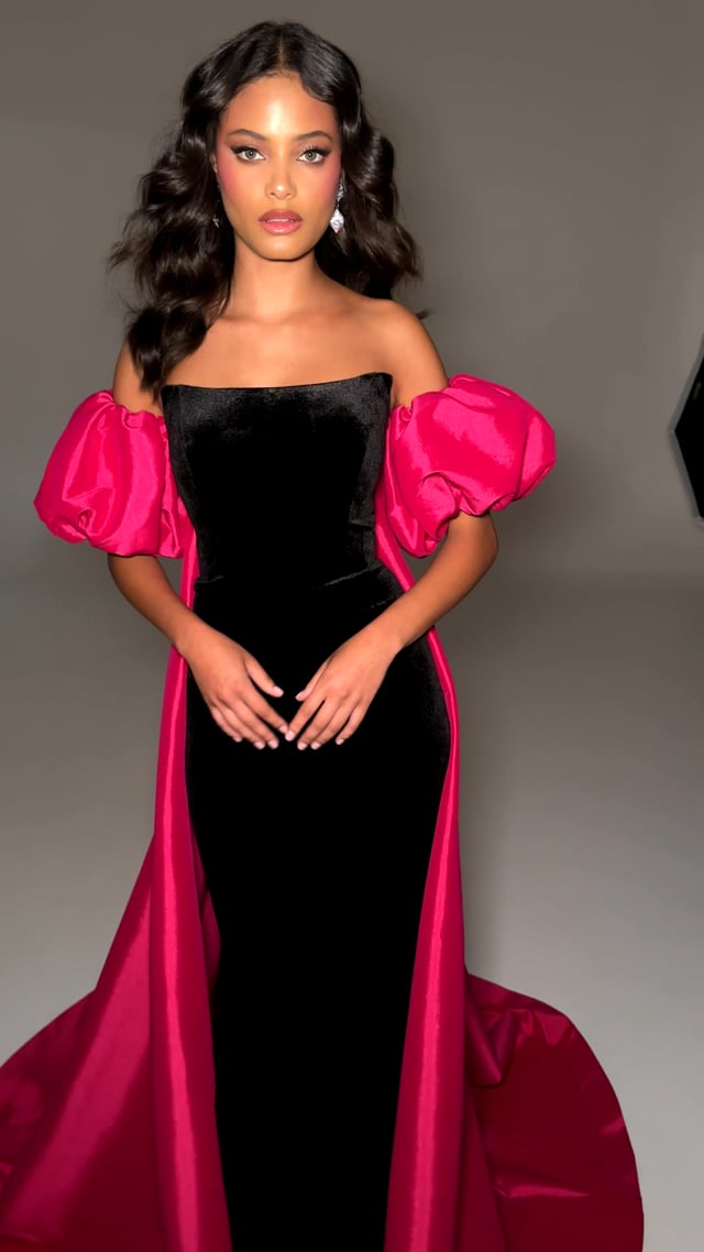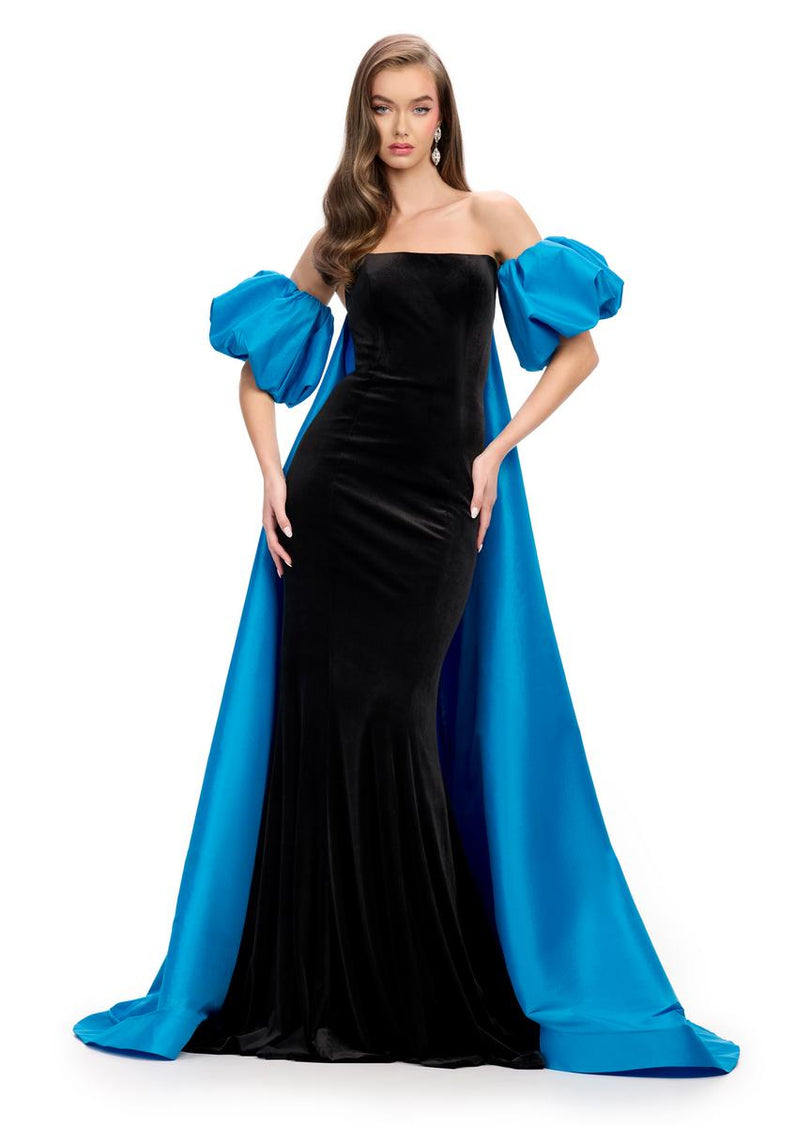 This elegant fitted velvet gown features a taffeta cape with oversized puff sleeves. With a strapless neckline, this gown is the perfect mesh of elegant and fun!