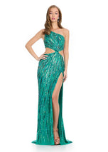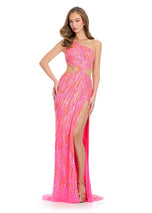 11789, is a unique and vibrant gown, making it perfect for Prom 2025. The slim fitting gown features a one-shoulder neckline, side cutouts with open back that exudes confidence . Designed with mulit-colored sequins in a linear pattern will definitely have all eyes on you and have you shining from every angle.