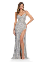 The beading and slim fitting silhouette are perfect for creating a dramatic entrance to your prom! 11812, is embellished with beautiful iridescent sequins from top to bottom. The linear pattern on this gown enhances your figure. The sweetheart neckline has thin beaded straps that lead to an eye-catching lace-up back for a snatched waist. Let's not forget about the thigh-high leg slit and sweep train.