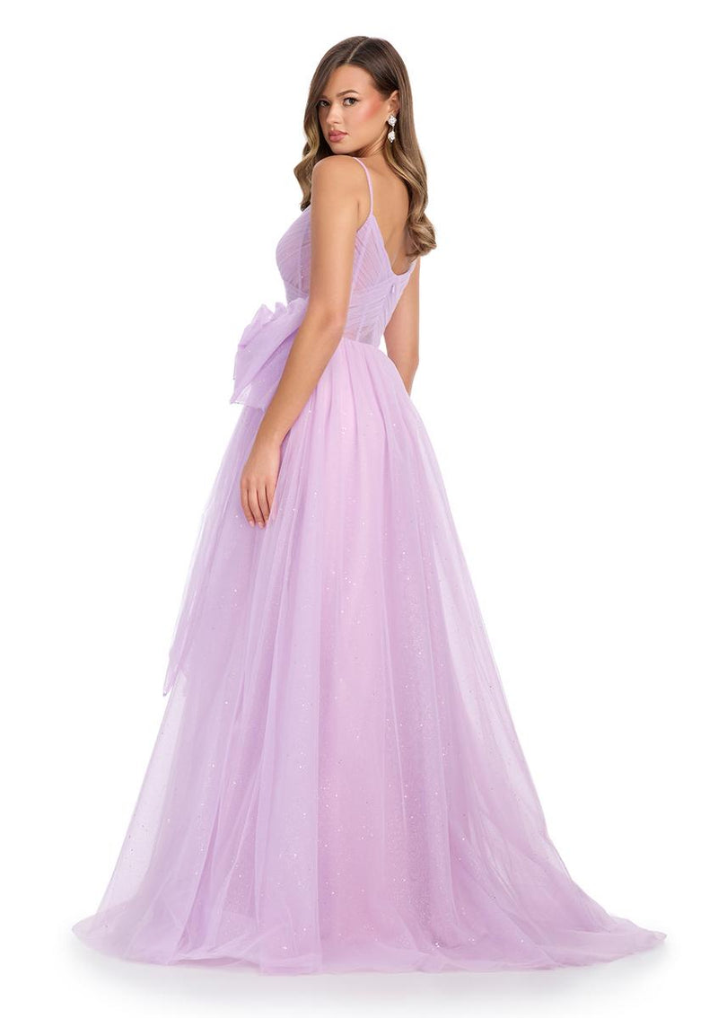 We are obsessing over the oversized bow this gown showcases! 11841, is a AshleyLauren creation from Spring 2025, that features a soft plunged neckline with spaghetti straps and zipper back closure. The tulle ballgown is made in full glitter that will have you shining from every angle! Let's not forget about the oversized bow detail on bodice that adds a dramatic touch! Suitable gown for Prom, Sweet 16 and so much more!