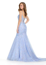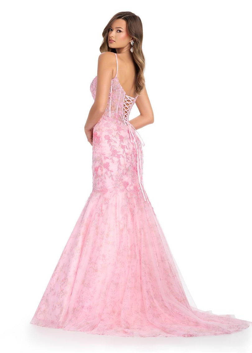 Spaghetti Strap Tulle Gown with Corset Bustier and Lace Up BackThis stunning spaghetti strap gown features a corset bustier with a lace up back. It is finished with tulle applique details and a mermaid style skirt.