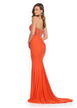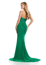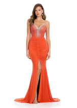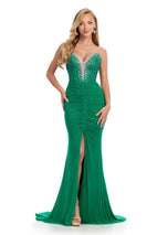Spaghetti Strap Gown with V Neckline and Press On StonesCalling all queens, this dress is for you! Featuring a breathtaking bustier with press on stones throughout, deep V-Neckline and center slit, this captivating gown will leave everyone in awe. 11855, features fun and unique details such as the crystal beading along the plunged neckline, middle ruching on the fitted skirt and middle slit. The corset top that will highlight your waist and has thin beaded straps that lead to a zipper back. Decorated with sparkling heatstones throughout the gown that will have you sparkling from all angles. Act now and grab yours now!
