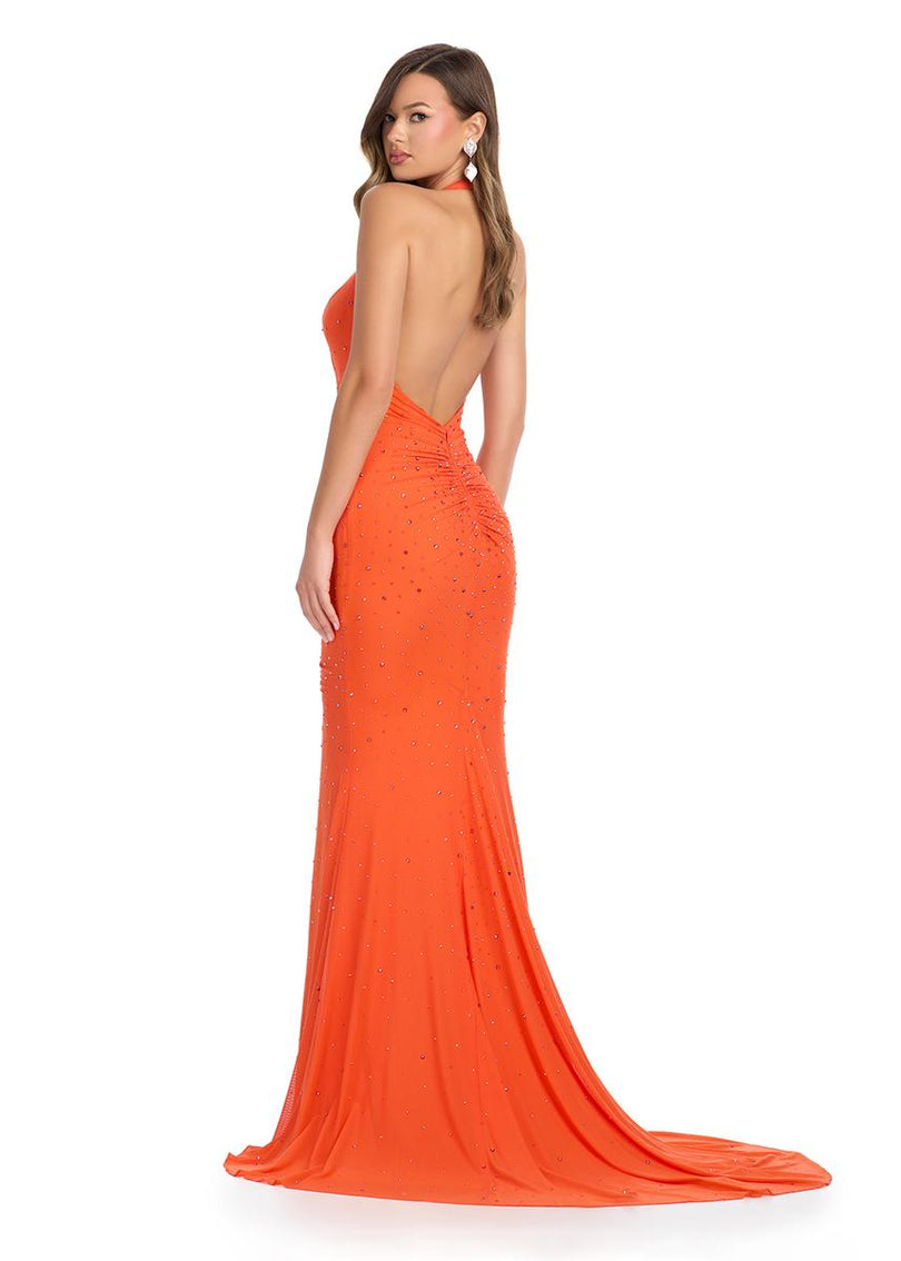 Fitted Gown with Halter Neckline and Open BackShine all night long in this halter neck gown embellished with press on stones throughout. The bustier is complete with a deep V-Neckline, halter top and open back. The gown is complete with a middle slit and sweep train.You can never go wrong with black! 11863 by ASHLEYLauren is just such a captivating gown that displays a plunged neckline with straps that wrap around the neck and lead to open back, giving it a sexy touch. Decorated with hot-fix stones from top to bottom will sure to have you dazzling all night long. Don't wait much longer and grab yours now at Terry Costa!