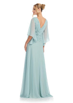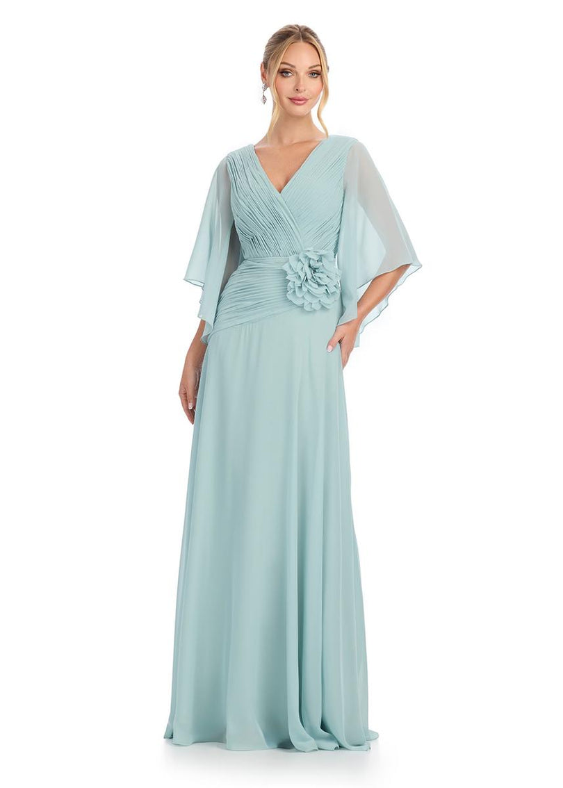 Chiffon Gown with Cape Sleeves and V NecklineThis stunning chiffon gown is complete with ruching throughout the bodice and a flower detail at the waist. The dress features an elegant deep V-Neckline and V-Back. The sleeves are finished with elegantly draped chiffon.