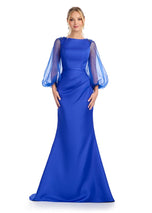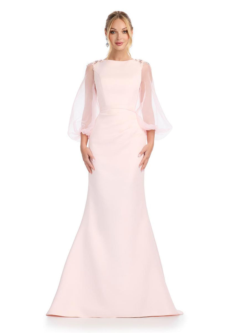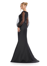 Fitted Satin Gown with High Neck and Oranza SleevesRadiate elegance in this beautiful satin gown that features balloon organza sleeves with a touch of sparkle! The wrap satin fitted skirt completes the look.