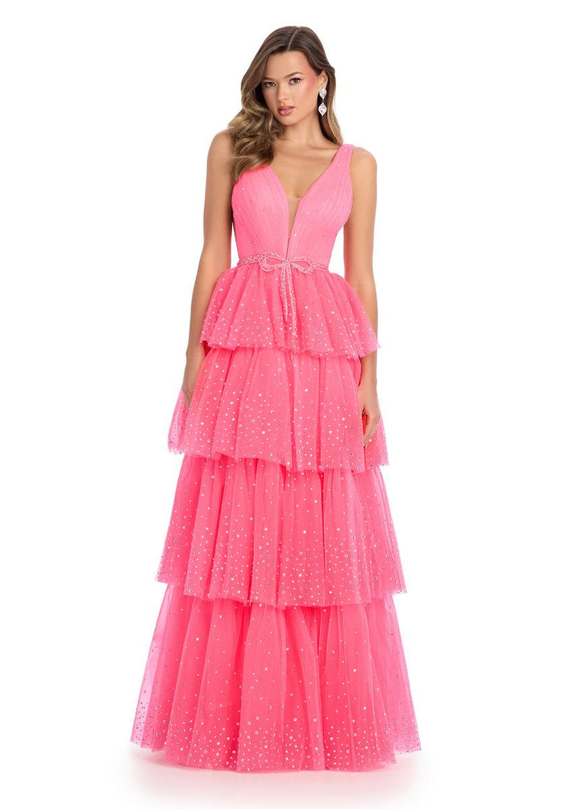Shine bright and turn heads in the ASHLEYlauren 11894 A-line tulle prom dress! This dress is all about the sparkle with a fully stoned bodice and tiered skirt that catches the light as you move. The bow belt adds a fun, flirty vibe while being covered in press-on stones for extra glam. Perfect for prom or any event where you want to stand out, this dress mixes elegance with playful charm. With its ruffled details and all-over sparkle, youll be ready to sparkle from every angle all night long. The flowy tulle fabric ensures youll move gracefully with each step, while the A-line silhouette flatters every figure. The dramatic tiered skirt creates an eye-catching look that will make you feel like the star of the night. Whether youre twirling on the dance floor or posing for pictures, this dress is sure to make a lasting impression. Step into your moment and make it unforgettable in this show-stopping ASHLEYlauren gown!