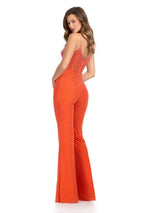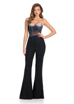 Turn heads in the ASHLEYlauren Illusion Heat Stone Corset Jumpsuit, style 11903. This glamorous jumpsuit features a structured corset bustier adorned with dazzling press-on stones, exuding sophistication. The sheer back detail adds an alluring touch, while the flared bottoms create a chic silhouette. Designed for versatility, its perfect for prom, galas, or a night out. The intricate embellishments ensure you sparkle under the lights, making it a standout choice for any occasion. Crafted for both style and comfort, this jumpsuit blends modern elegance with timeless appeal. Elevate your fashion game with this statement-making ASHLEYlauren creation. Everyone will remember your iconic look in this must-have piece!