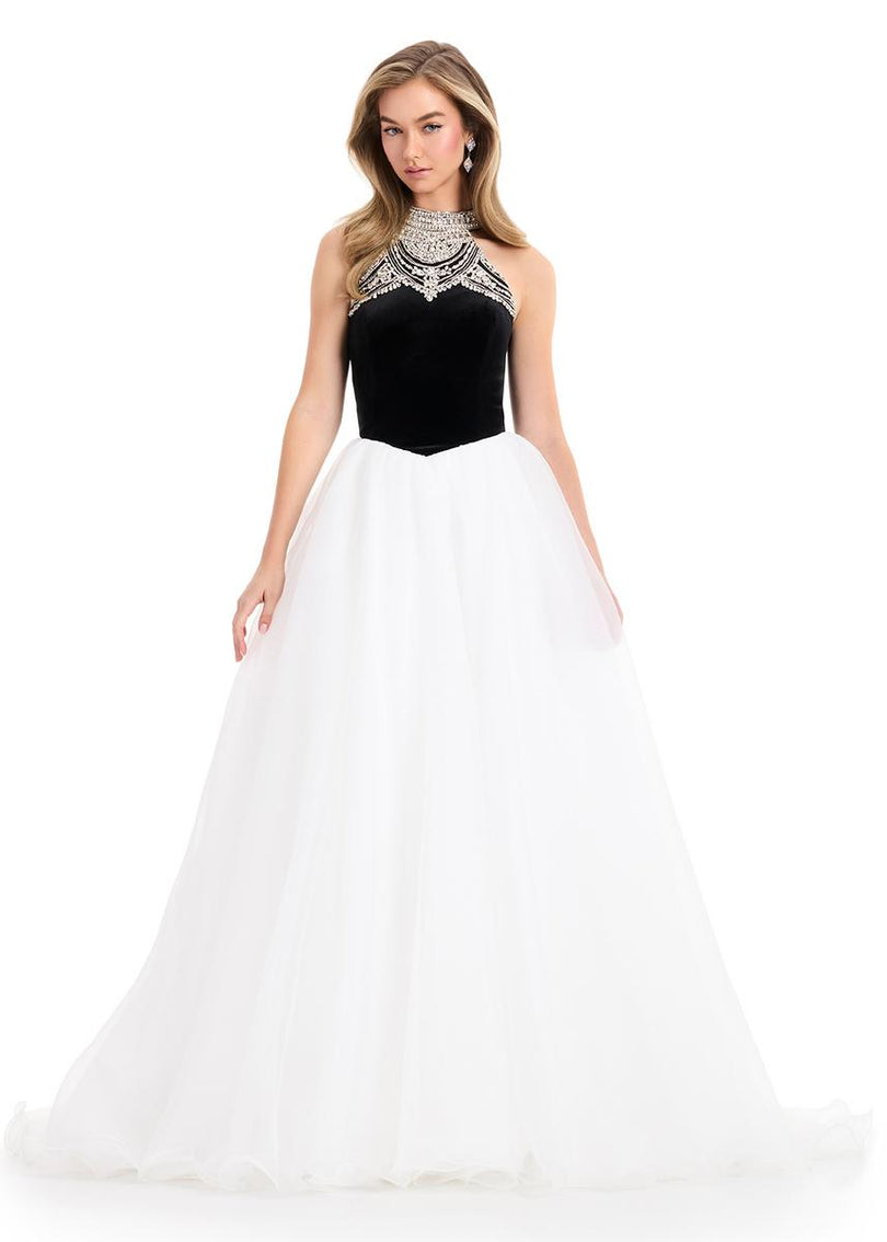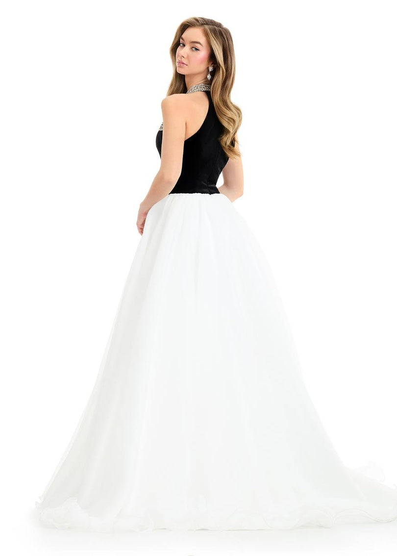 Command every gaze in the breathtaking ASHLEYlauren Style 12050! This isn't just a gown; it's a magnificent masterpiece designed to ensure your presence at prom, a pageant, or any formal occasion is nothing short of legendary. Prepare to captivate with this stunning blend of rich textures and dramatic design.The 12050 features a luxurious velvet bodice that provides a structured, elegant fit, adorned with a beautifully beaded halter neckline that sparkles with every turn. From this exquisite bodice, the gown gracefully flows into a full organza skirt, which cascades with voluminous elegance and culminates in a truly dramatic train. This combination creates a silhouette of unparalleled impact and sophistication.Which exquisite shade will you choose to make your unforgettable statement? This high-neck, long prom dress is available in two captivating options: majestic Royal for a truly regal presence, or sophisticated Black/Ivory for a timeless and striking contrast. Embrace the elegance and impact of the ASHLEYlauren Style 12050 and own your moment!