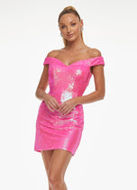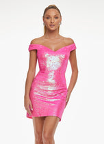 Off the Shoulder Sequin CocktailDazzle the night away in this off the shoulder fitted cocktail dress featuring our signature criss-cross back. This cocktail dress is sure to turn heads at your next event.