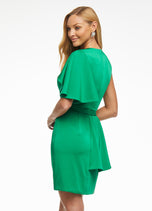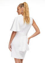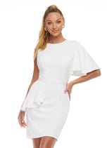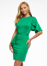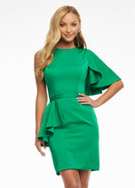 Crepe Fitted Cocktail Dress with RufflesStand out in this asymmetrical crew neckline cocktail dress. It features ruffles on the right sleeve and left hip to perfectly accentuate your figure.