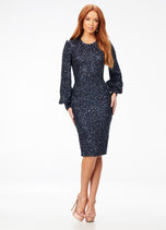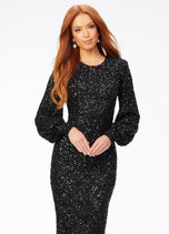Elegant sequin gown featuring a crew neckline with bishop sleeves. The look is completed with a fitted tea length skirt and full zipper back.