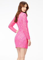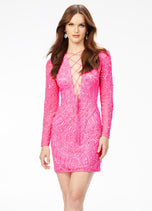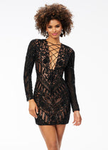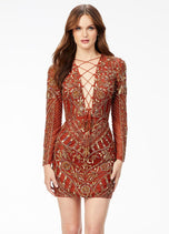 Bring the drama in this fitted hand beaded cocktail dress! The lace-up bustier is embellished with an intricate bead pattern cascading onto the fitted skirt and sleeves.
