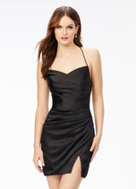 The simplistic fitted cocktail dress features an exquisitely draped bodice giving way to a wrap fitted skirt. The look is completed with a left leg slit and open lace up back.