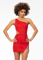 This one shoulder scuba cocktail dress is accented by an illusion cut out side at the waistline. The left leg slit is embellished with crystal detailing.