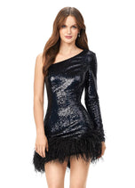 One sleeve sequin cocktail dress with asymmetrical hem. The hem is trimmed with tonal feathers.