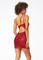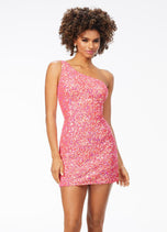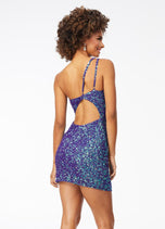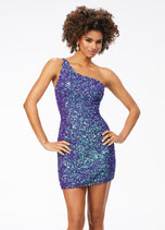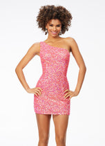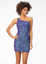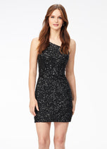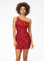 Sassy in sequins! This handbeaded sequin cocktail dress features a one shoulder neckline with adjustable back strap. The look is complete with an open back and fitted skirt.