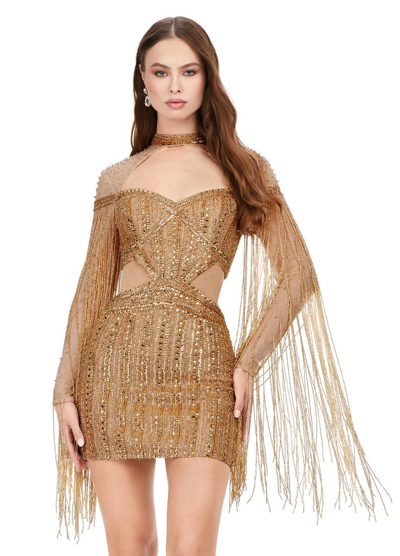 Make an entrance that is sure to steal the show. This fully beaded cocktail features a sweetheart neckline, open back and illusion cut outs at the waist. Long sleeves with fringe complete the look!