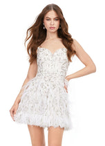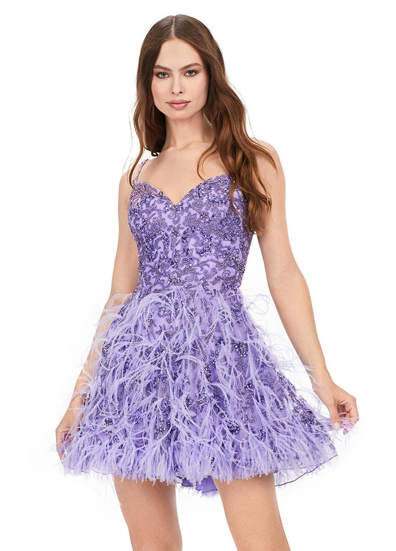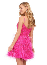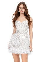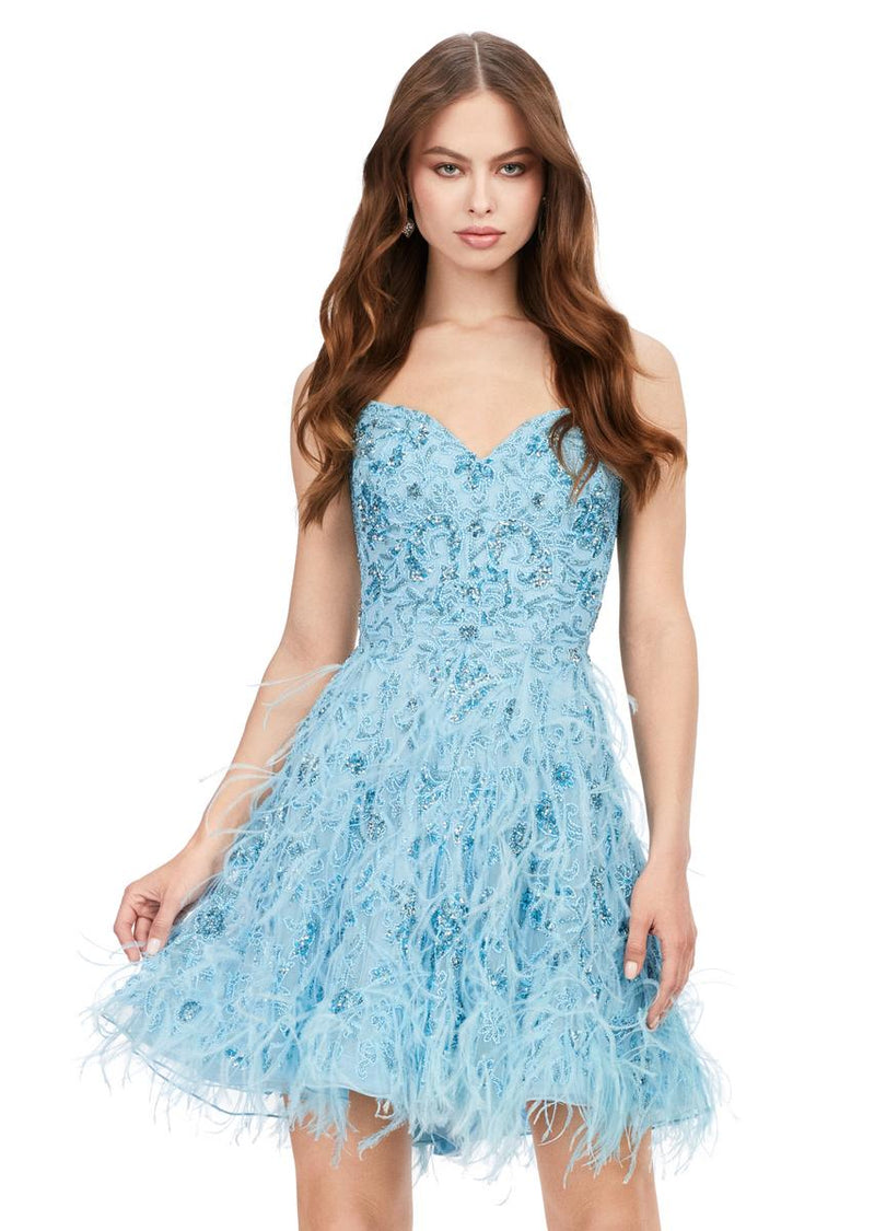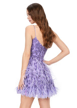 Turn heads in this fabulous cocktail dress which features beading throughout and pops of feathers on the skirt. The perfect gown for some fun on the dance floor or stage!