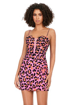 This fully beaded cheetah print cocktail dress gives all the fun and flirty vibes! The beaded spaghetti straps and corseted bodice finishes the look.