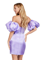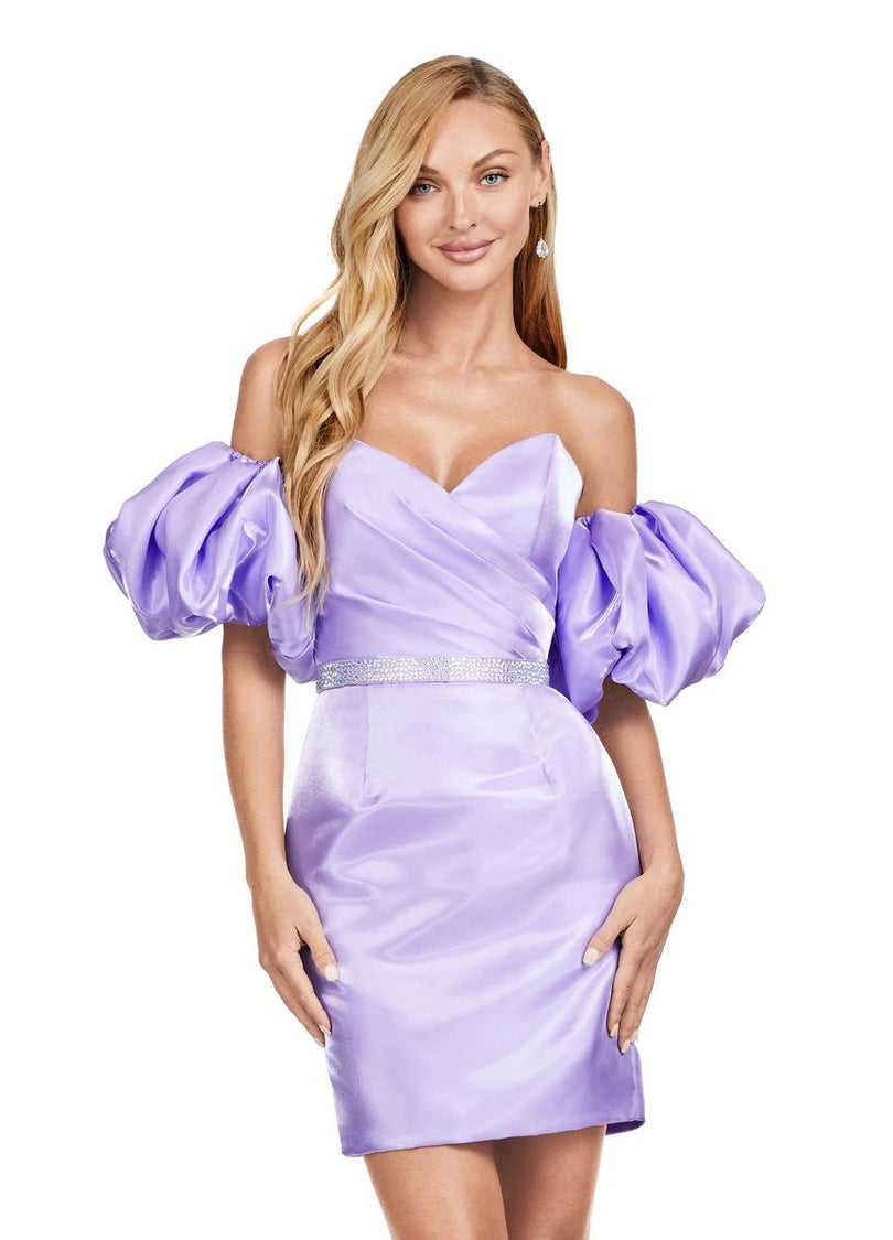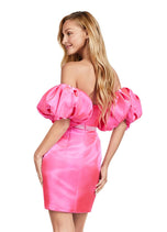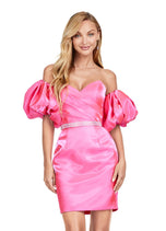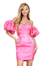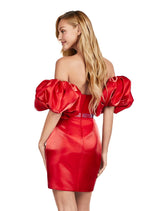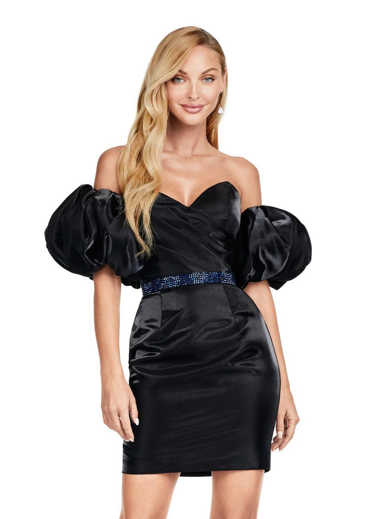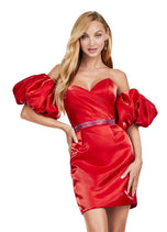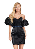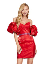 Stand out in this fabulous cocktail dress. This look has a sweetheart neckline, oversized puff sleeves and a hot press stone belt.