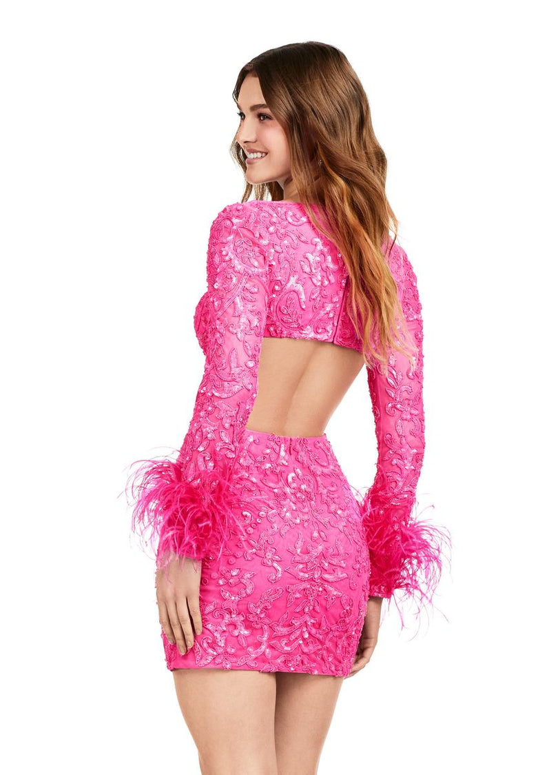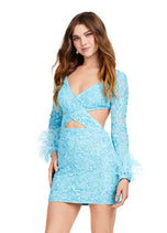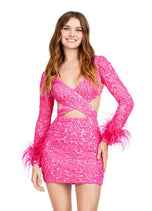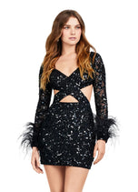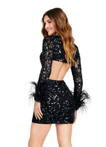 We're loving this fully beaded cutout dress! With long sleeves that are trimmed in feathers, this fitted dress is the perfect combination of fun and flirty.