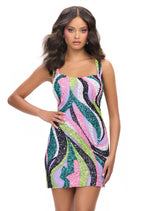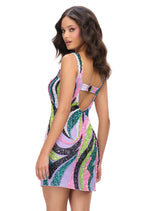 Unique and fabulous! This multi-colored cocktail dress has an intricate bead pattern throughout that will accentuate your figure. This look is complete with a back cut out.