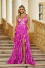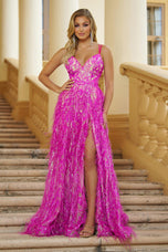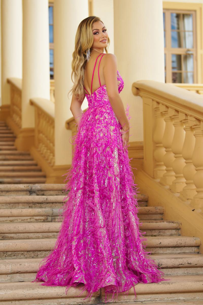 Designed to command attention, the Ava Presley Style 28259 channels sophistication through its meticulous details. The double straps add a modern flair, accentuating the sequined embellishments that shimmer with every movement. The scattered feathers lend a luxurious and opulent air, creating an ensemble that's as elegant as it is mesmerizing. Elevate your presence at pageants or prom nights with this gown, promising an evening of unparalleled glamour and timeless sophistication.