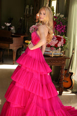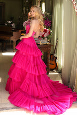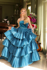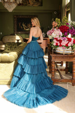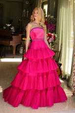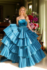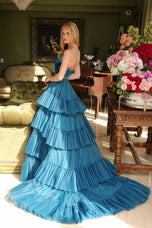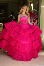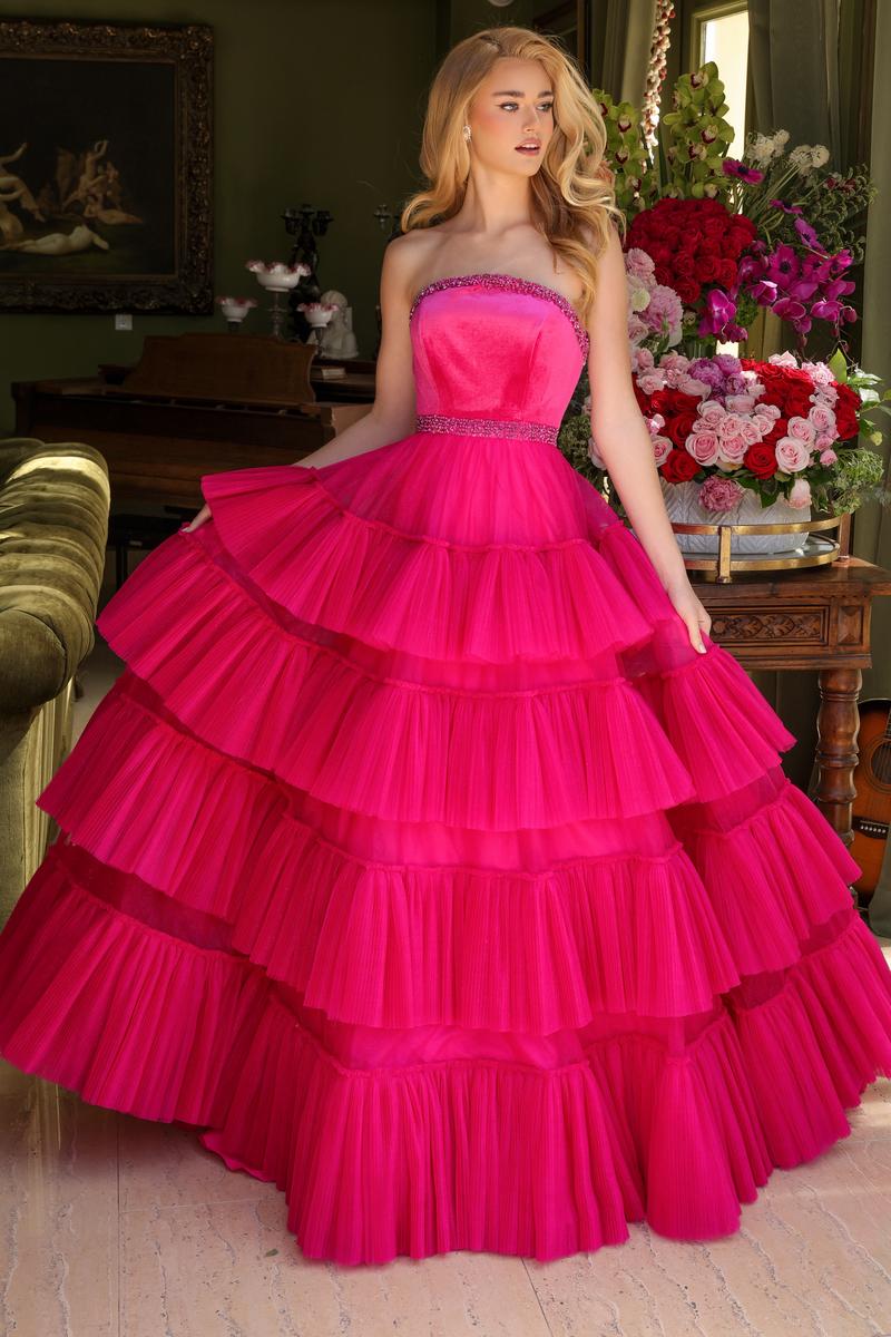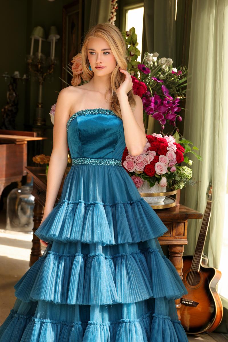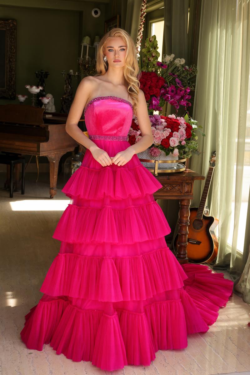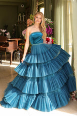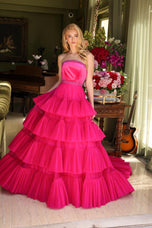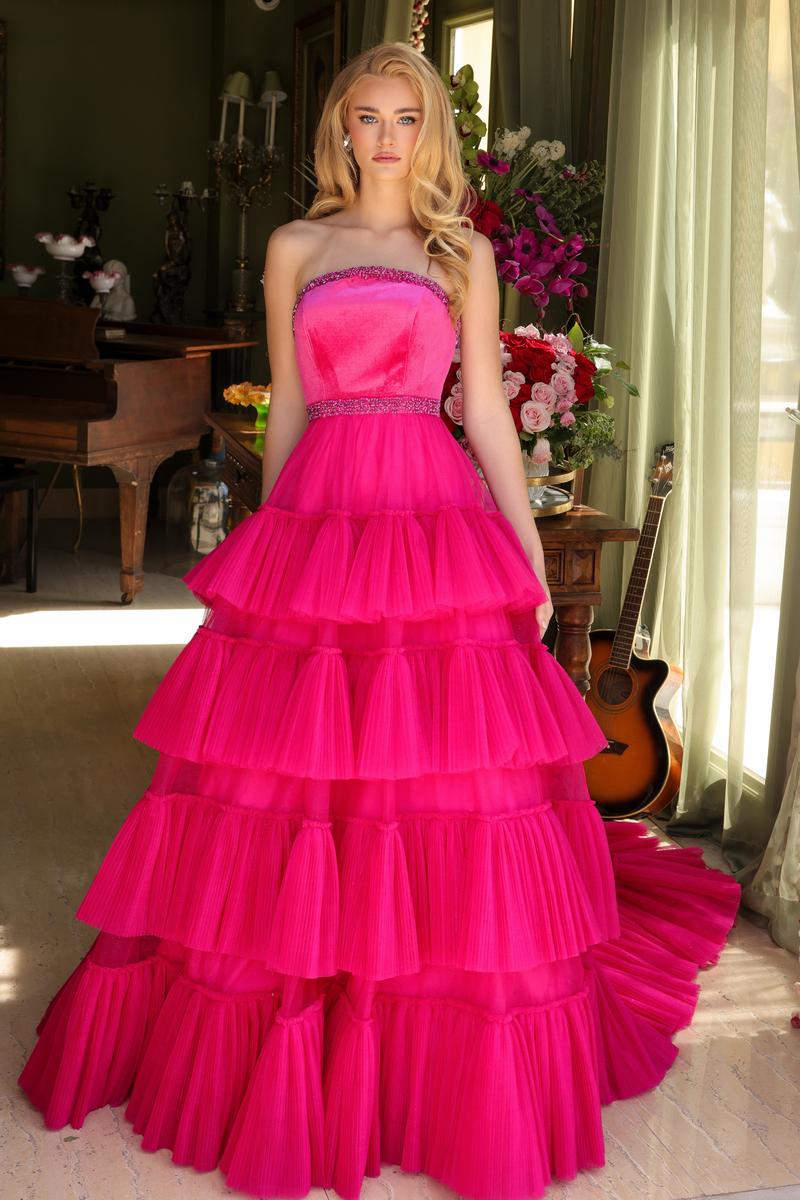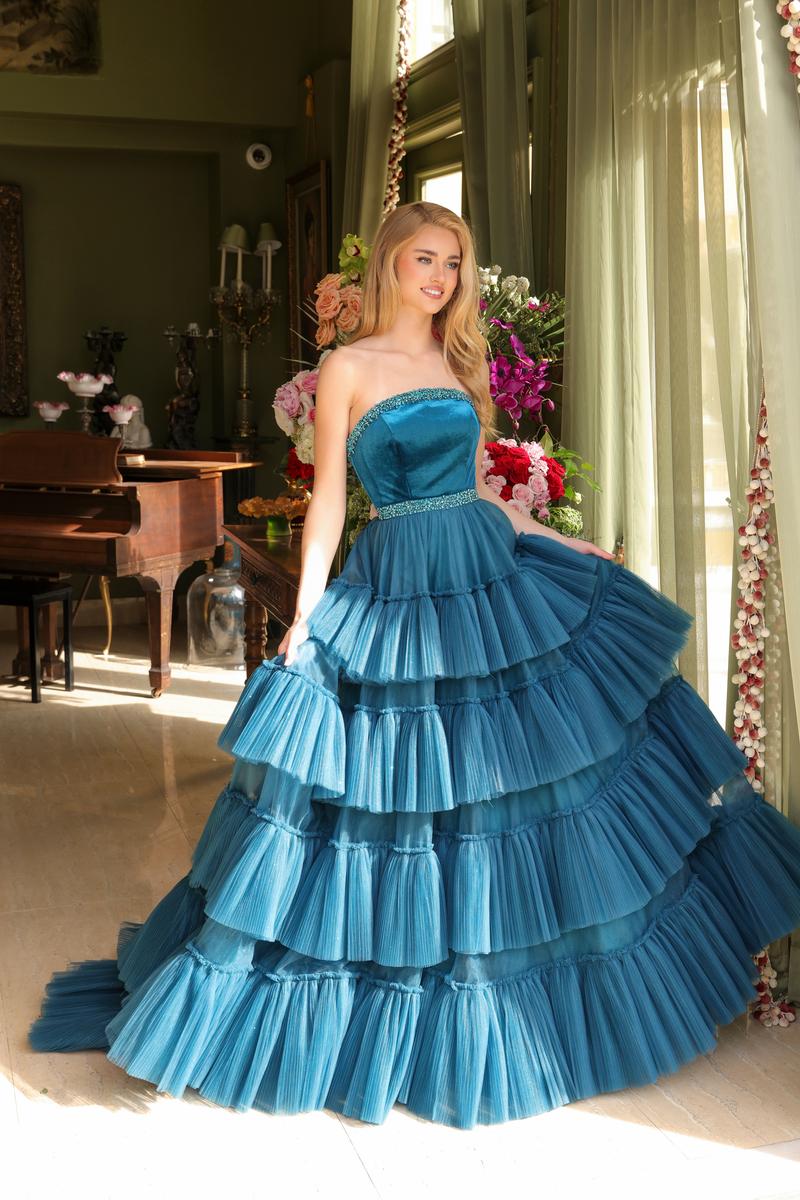 Embrace the Spotlight in the enchanting Ava Presley creation! This timeless masterpiece transitions effortlessly between prom nights, pageant stages, and evening soirees. The strapless design showcases your dcolletage and shoulders beautifully, while the fitted bodice flatters your figure. Crafted from ethereal tulle, the voluminous skirt cascades down in tiers, creating a dramatic and unforgettable silhouette. A shimmering, sparkly accent cinches the waist, adding a touch of glamour that catches the light with every move. This Ava Presley creation is the perfect prom dress or evening dress for a dazzling arrival.