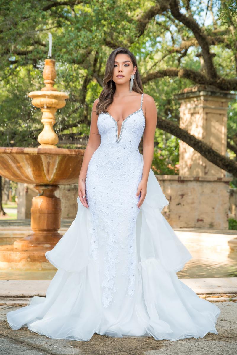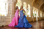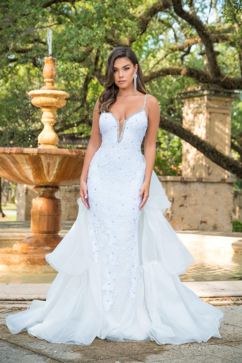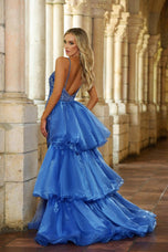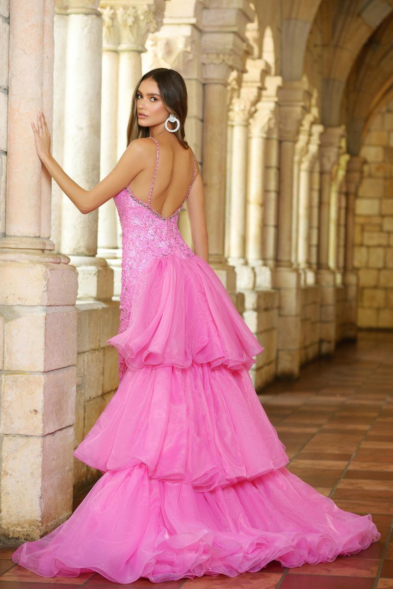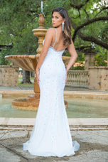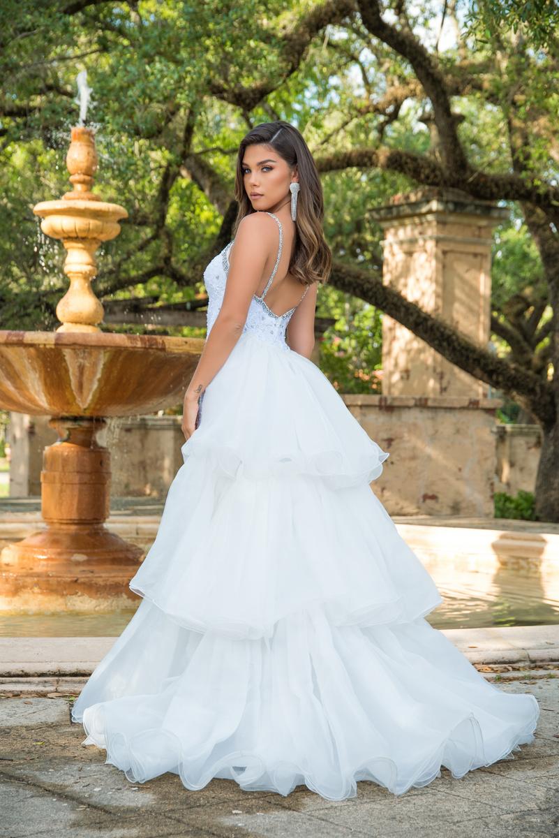Introducing Ava Presley's Style 38813, a beaded prom dress designed to captivate hearts. The plunging neckline, bordered with rhinestones, exudes sophistication and allure. Delicate floral sequin accents further enhance the enchantment of this stunning ensemble. Featuring a detachable tiered ruffle prom dress skirt, this gown offers versatility and charm, promising an unforgettable and elegant look for your special occasion.