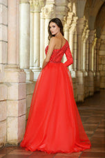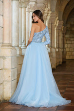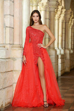 Make an entrance in the Ava Presley Homecoming 2024 collection with this stunning long dress. The one-shoulder long-sleeve design adds a touch of elegance, while the fitted silhouette accentuates your curves. Crafted from exciting and sparkly sequin fabric, this dress catches the light with every move. The dramatic slit adds a hint of allure, complemented by an attached tulle overskirt that creates a dreamy, ethereal effect. Perfect for making unforgettable memories, this dress combines sophistication and glamour, ensuring all eyes are on you at your next event.