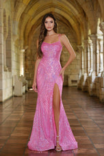 Embrace an evening of elegance in Ava Presley's 2024 Homecoming Collection. This long dress is a vision of sophistication, featuring delicate thin straps that complement the fitted silhouette. The sequined fabric catches the light with every movement, ensuring you shine all night long. A daring slit adds a touch of allure, while the lace-up back adds a hint of drama and charm. With its fun and different design, this dress is perfect for making a statement on any special occasion. Celebrate in style and dance the night away in this unforgettable gown.