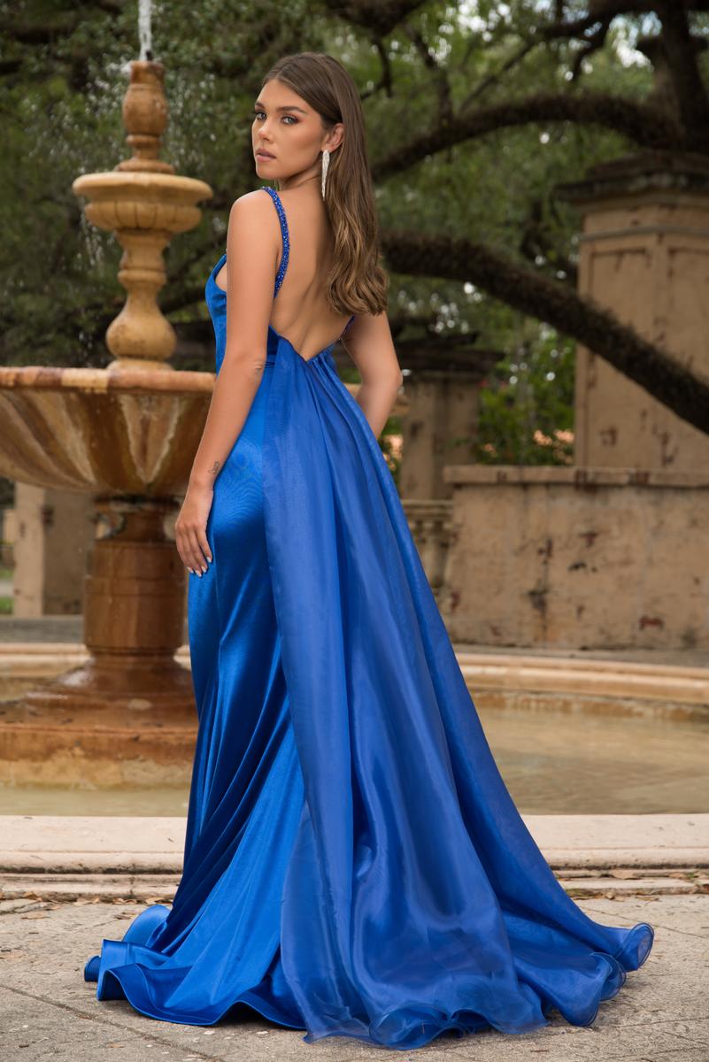 Make a grand entrance in the Ava Presley 38922 prom dress a perfect blend of sleek elegance and modern drama. This fitted gown hugs your curves beautifully, featuring a daring open low back and delicate straps for a flirty touch. The flowing floor-length chiffon cape adds movement and sophistication, while the high slit gives just the right amount of edge. Designed for the girl who wants to feel effortlessly glamorous, confident, and unforgettable all night long.
