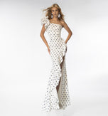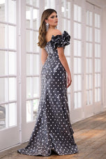 Explore enchanting elegance with Ava Presley's Style 39264, a delightful prom and evening dress adorned with a playful polka dot pattern. This captivating ensemble features a chic one-shoulder design enhanced by a charming ruffle shoulder detail, exuding grace and allure. The dress showcases a delightful ruffle slit detail, adding movement and flair to the playful yet sophisticated look. With its seamless fusion of whimsical design elements and timeless sophistication, this Ava Presley creation promises a standout presence at prom night, ensuring a memorable and captivating experience for a night filled with joy and celebration