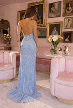 Elevate your prom game with the Ava Presley Long Halter Prom Dress 47049! This stunning evening gown features a daring plunging neckline that radiates confidence. The dazzling sequin bodice sparkles beautifully, catching the light with every movement. The flowy skirt boasts a chic paisley design, adding a trendy touch that sets you apart. With a stunning high slit, this dress is perfect for showcasing your legs and turning heads at prom. Ideal for creating unforgettable memories, get ready to dance the night away in style!