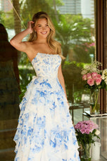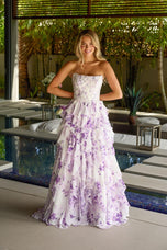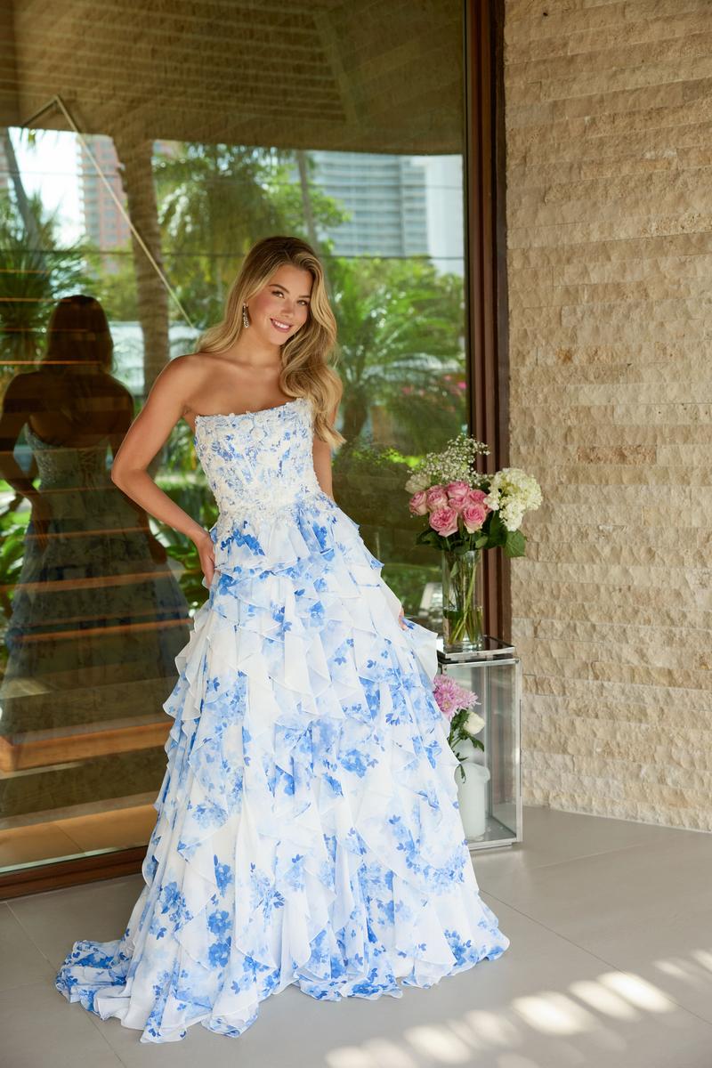 Turn heads in the Ava Presley Prom Dress 47145! This strapless ball gown features a straight-across neckline, a corset-style bodice, and a lace-up back. The chiffon skirt with layered ruffles and a delicate floral pattern adds romantic elegance, perfect for a dreamy prom look.Designed to flatter your figure and flow beautifully as you move, the Ava Presley 47145 prom dress combines sophistication and fun. With its stunning details and whimsical silhouette, its the ultimate choice for making prom night unforgettable.