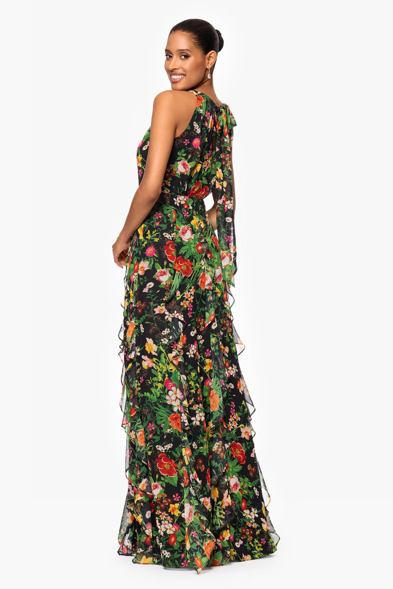 Betsy and Adam "Camille" Floral Print Chiffon Ruffle Dress A27102