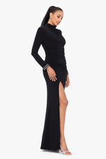 Step into timeless elegance with the Betsy and Adam Roxie Dress, style A26766. Crafted from a luxurious jersey knit, this stunning gown features a sophisticated high neckline with graceful ruched detailing that enhances its refined silhouette. The fitted design accentuates the waist beautifully, while a daring thigh-high slit adds a bold, modern edge. Long sleeves with sparkling embellished cuffs bring an extra touch of glamour, perfectly balancing the open-back detail for a striking look from every angle. Fully lined and finished with a hidden back zipper for a smooth fit, this dress is an unforgettable choice for any formal evening occasion.