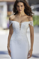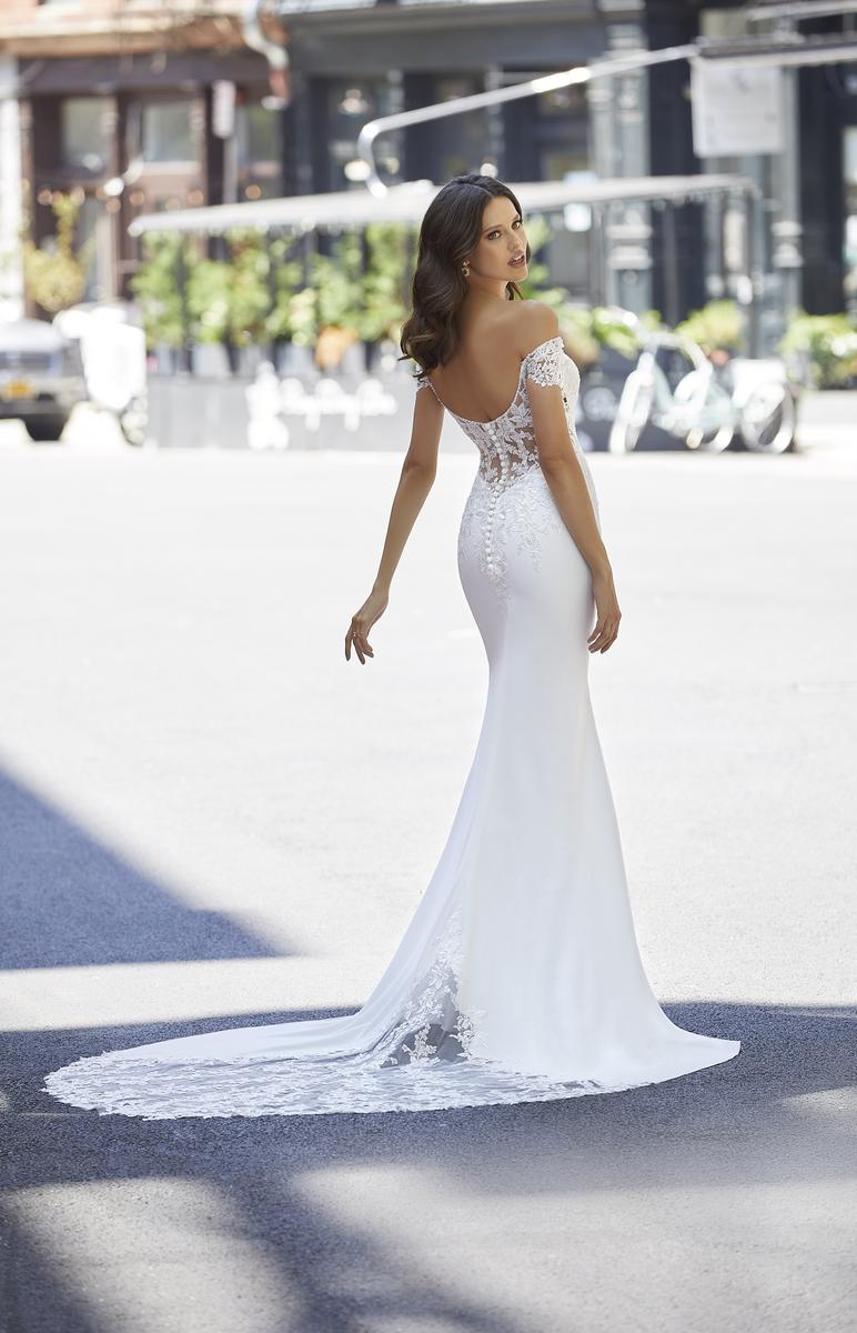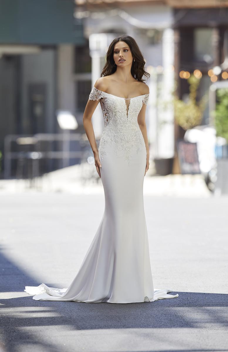 The name of this Morilee Blu Gown is JewelSeductively sleek, our Jewel wedding dress is anything but simple. The shapely sheath gown beautifully hugs all your curves and has a modern off-the-shoulder neckline decorated with blingy beaded trim. The intricate bodice detail continues with delicately beaded, embroidered appliques and sultry sheer plunge. The illusion back is a stunning contrast to the sleek crepe skirt and the cut-away lace train is a romantic touch. Shown in Ivory/Honey.
