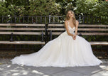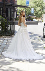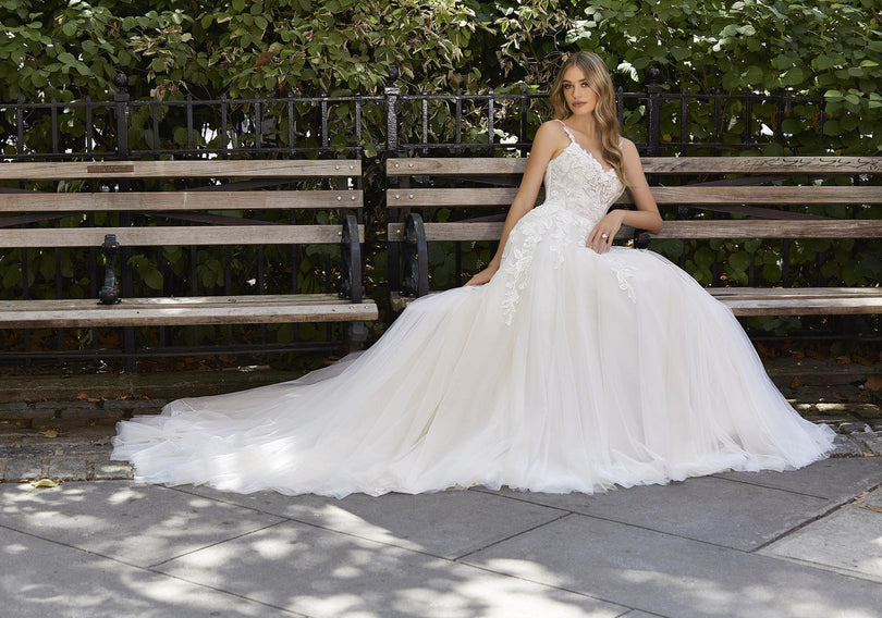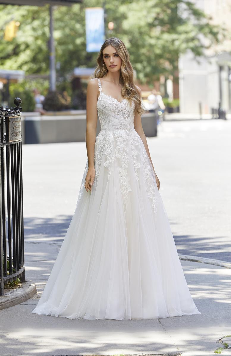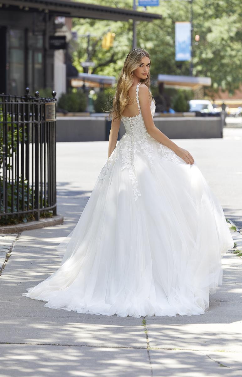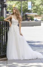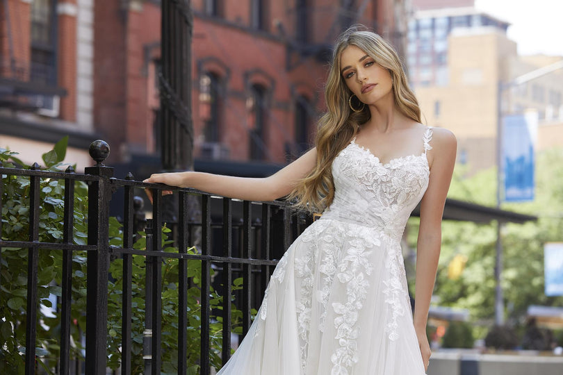 Airy and elegant, the Julianna designer wedding dress from the Spring 2023 Blu Bridal Gown collection is a breath of fresh air. The delicate A-line has a romantic Chantilly lace bodice adorned in delicately beaded, frosted lace appliqus that cascade down the gown. A draped detail helps to cinch in your waist and flows into the tulle skirt that floats off the body. Perfect for an elegant outdoor ceremony or formal occasion under the stars! Please call our Dallas, Texas location to check in store availability, pricing, and current ship dates.