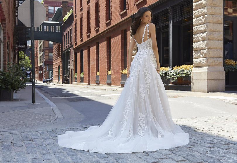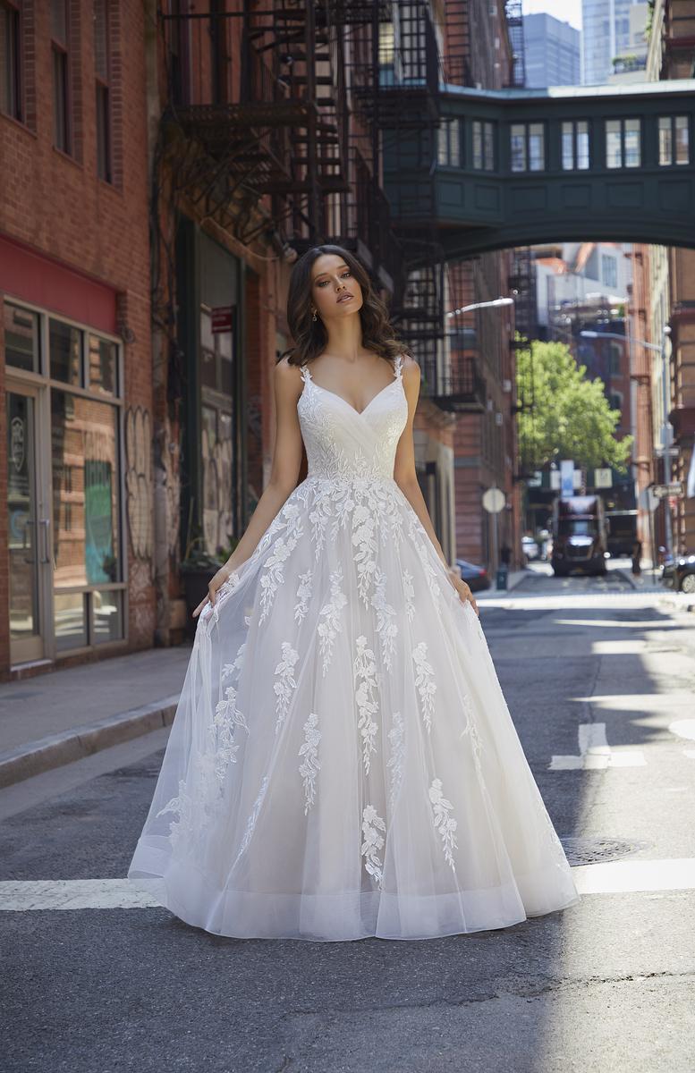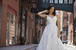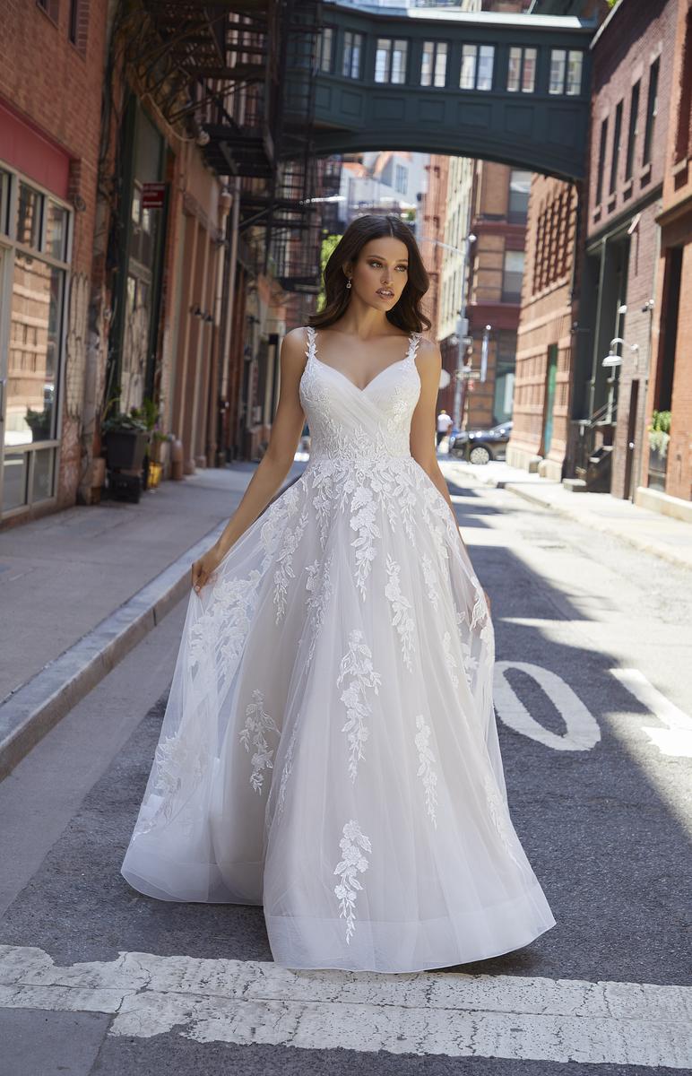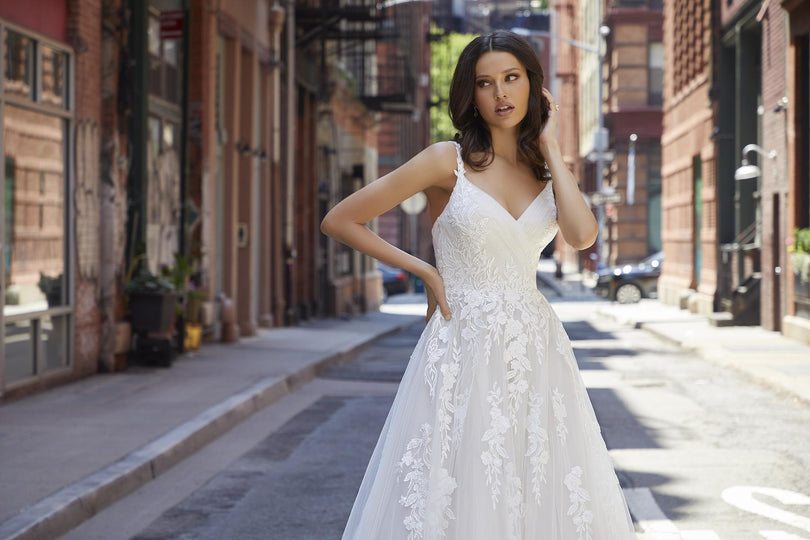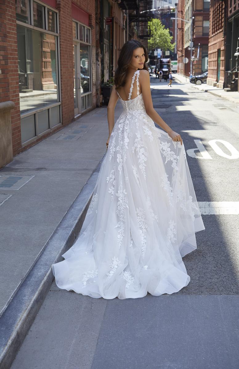 A classic bridal gown with modern touches, this is Jocasta from the Spring 2023 Blu Bridal gown collection. A dress that's all about the details, the Jocasta designer wedding dress features a delicately draped v-neckline with decadent frosted, embroidered lace appliqus framing the bodice. The soft tulle A-line skirt beautifully flares out with cascading floral appliqus, meeting up with a wide horsehair hemline for a textured effect. Whether you're planning a romantic formal occasion or a fun and flirty outdoor ceremony, you'll love the way you feel in this look. She's even available in three lengths to make alterations a breeze for our petite and tall brides alike. Please call our Dallas, Texas location to check in store availability, pricing, and current ship dates.