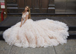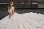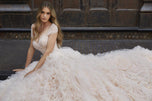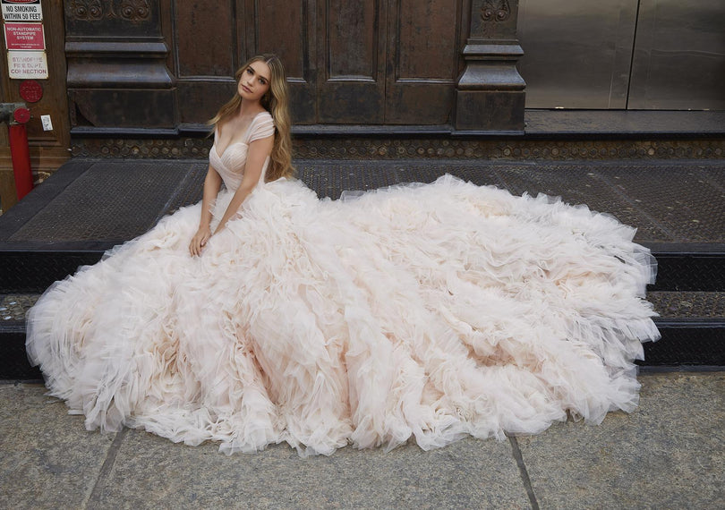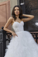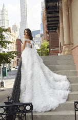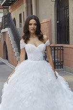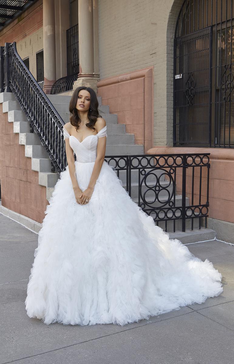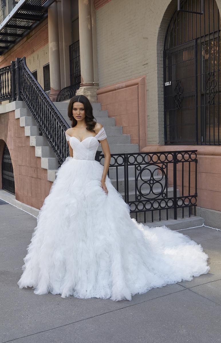 The name of this Morilee Blu Gown is JosefinaIf you want drama and glamour, look no further than our Josefina designer wedding dress. The over-the-top ball gown features a delicately draped bodice with romantic sweetheart neckline and a matching detachable tie-back stole. The ruffled tulle skirt creates fabulous texture with a subtle, swirling floral motif for a gown that will leave guests gasping as you walk down the aisle. Shown in Ivory/Porcelain and Bellini. Available in three lengths: 55", 58", 61".