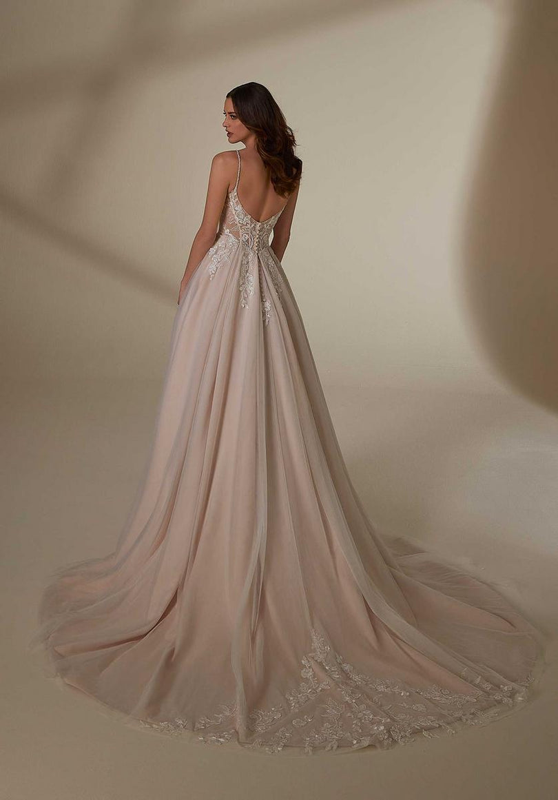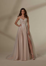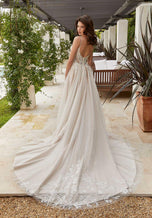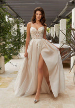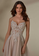 Oh my.. this wedding gown called Maya is designed by Morilee Blue screams, sexy, flirtatious, alluring, the list goes on! 4122, is from Fall 2023 Line that features a stunning bustier bodice adorned with dazzling crystal and lace embroidery. A v-neckline with dainty straps that lead to low v, zipper back. The pleated tulle skirt floats off the body effortlessly and is completed with a sexy side leg slit that will sway with every step that you take down the aisle. Visit us in store to try this gem on or call us for additional details.