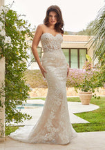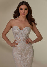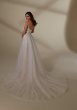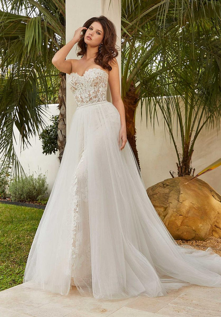 This Morilee Blu wedding gown will have everyone teary-eyed as soon as you take your first step down the aisle. The name of this beauty is Megan and showcases a fierce fit and flare silhouette that will define your curves perfectly. The sheer corset bodice has a strapless, sweetheart neckline and zipper-button back. The gown is decorated with crystal beaded embroidery on lace, creating a layered lace effect. Style this gown with a detachable tulle overskirt with crystal beaded waistband for a fuller silhouette, style 11463 and is sold separately. This is perfect for two looks in one, on your special day! Give us a call at Terry Costa for additional details.